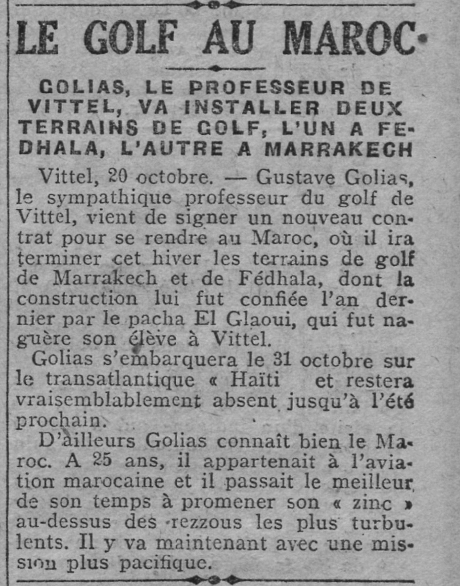 Dés 1926, Roger Golias a alors 4 ans, la famille part vivre la moitié de l'année à Marrakech, où Gustave Golias son père, dessine et réalise les travaux du Royal Golf de Marrakech.